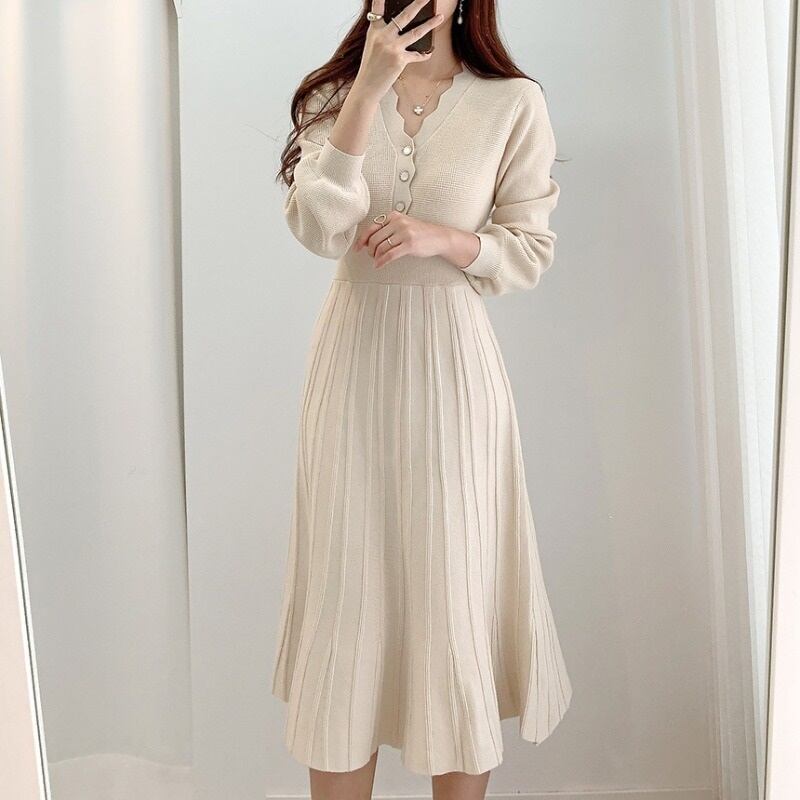 冬のスカート、コート、長いセータースカート、膝上、ウエストを伸ばす、Vネックのニットドレス、女性の秋と冬 ロング オータム 秋物 ウィンター 冬物 yingd34175562612