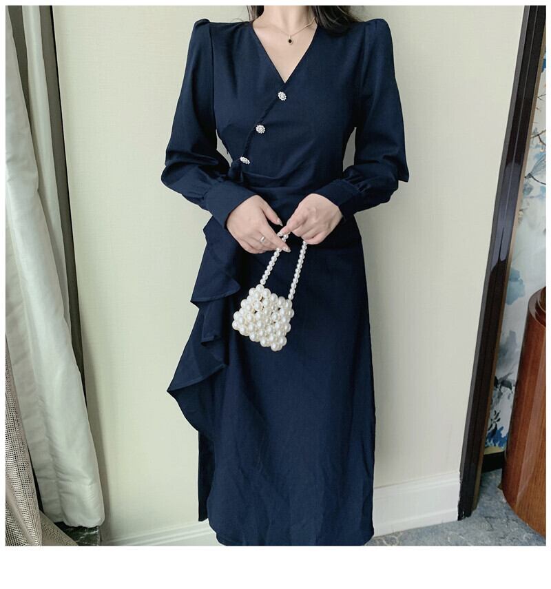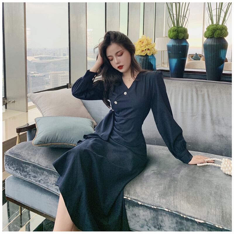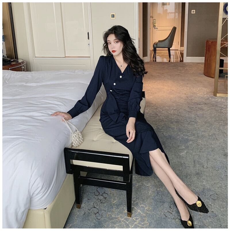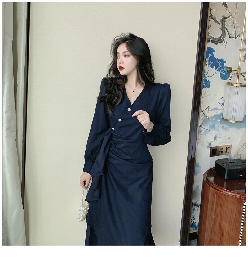 フランスのレトロなヘップバーンスタイルのウエストとスリムな気質のセクシーなVネックデザインのパフスリーブドレスの女性のロングスカート yingd67886341475