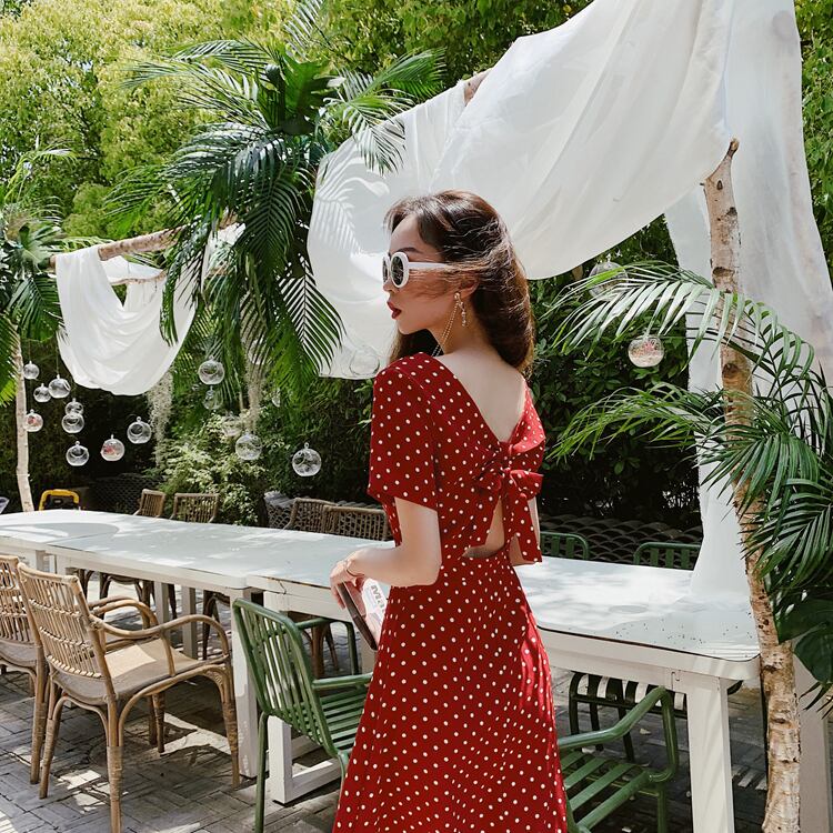 スカート2020新夏フレンチレトロウエストウエスト細い気質セクシーな背中の開いた注意深いマシンドレス女性 サマー 夏物 yingd32929607590