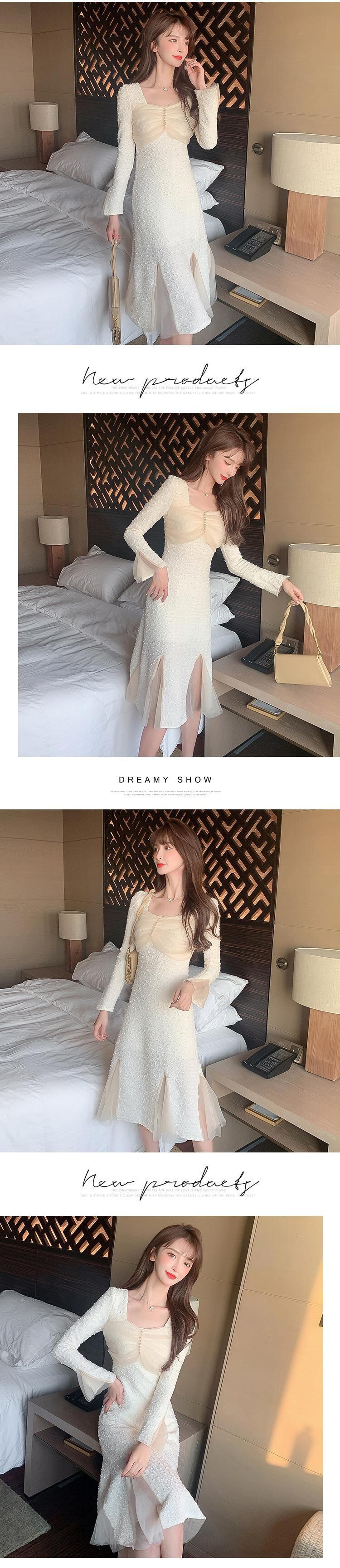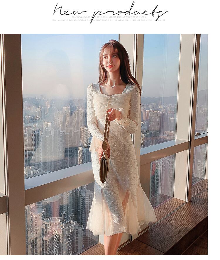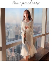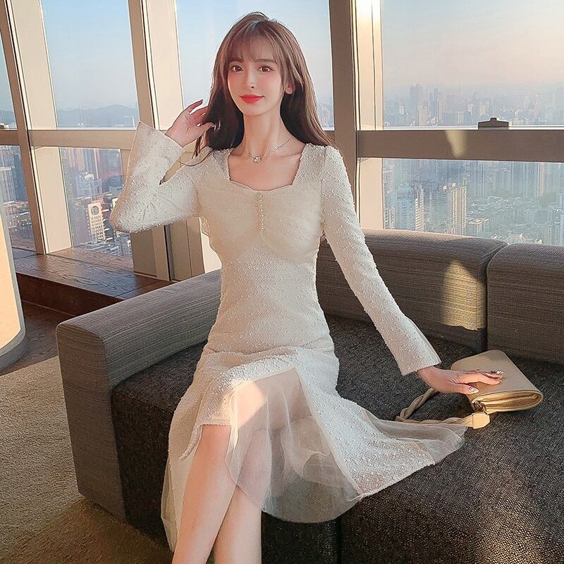 2021年春の新しいフレンチレトロライトラグジュアリーデザインスカートスクエアネックメッシュステッチセクシーなドレスの女性 スプリング 春物 スクウェア yingd78881020734