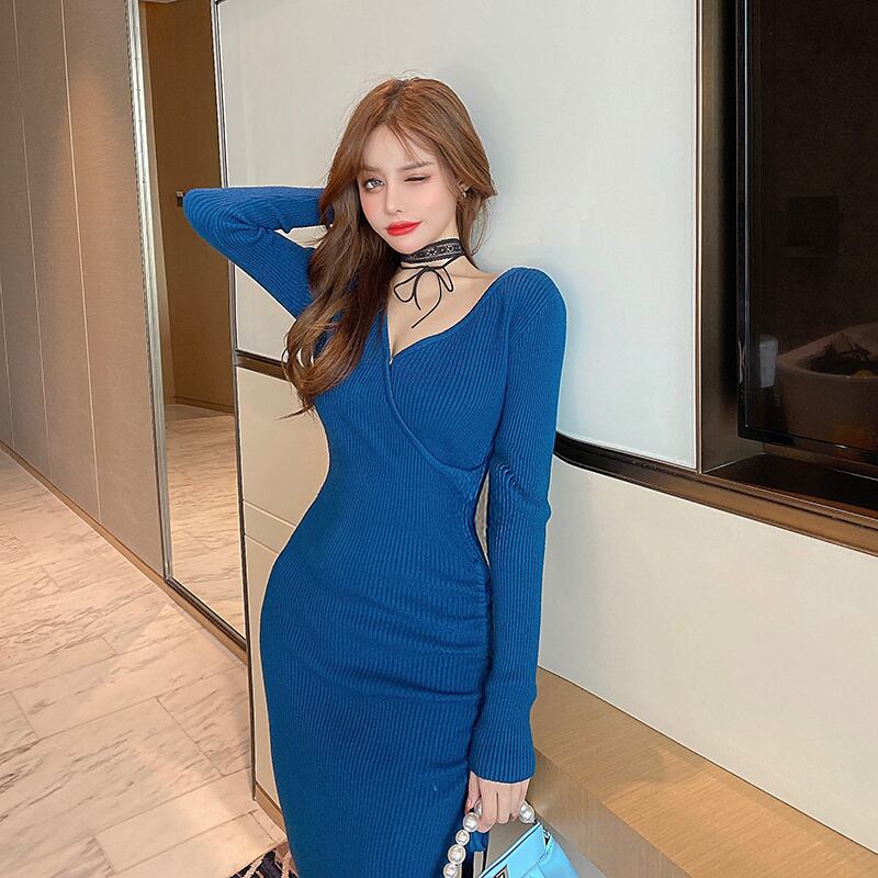 コート、ロングスカート、長い膝上セーター、気質、Vネック、セクシーなパッケージのお尻、スリムなニットドレス、女性の秋と冬 オータム 秋物 ウィンター 冬物 yingd9364026118