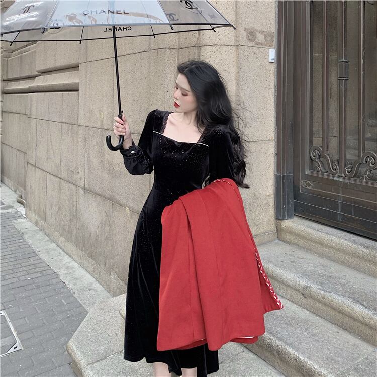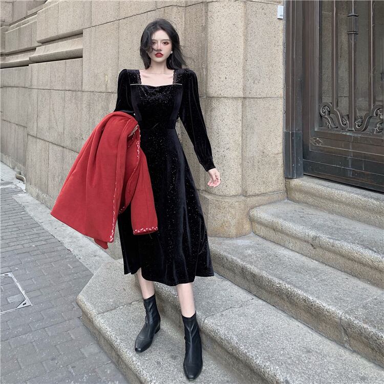 フレンチレトロヘップバーンスタイルリトルブラックドレス気質ライトラグジュアリーレディーススリムレーススクエアカラーベルベットドレスレディース秋冬 オータム 秋物 ウィンター 冬物 スクウェア yingd7339681055