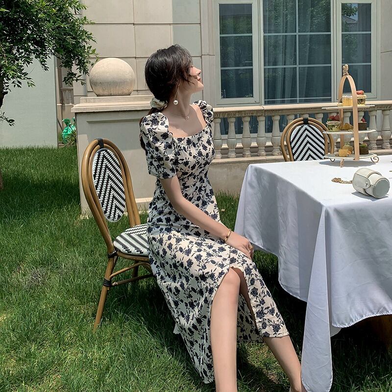 フランスのレトロなスクエアネックパフスリーブロングスカートは薄くて気質の高い女神ファン小さなデイジーフローラルドレス女性の夏 サマー 夏物 花柄 スクウェア yingd59801604804