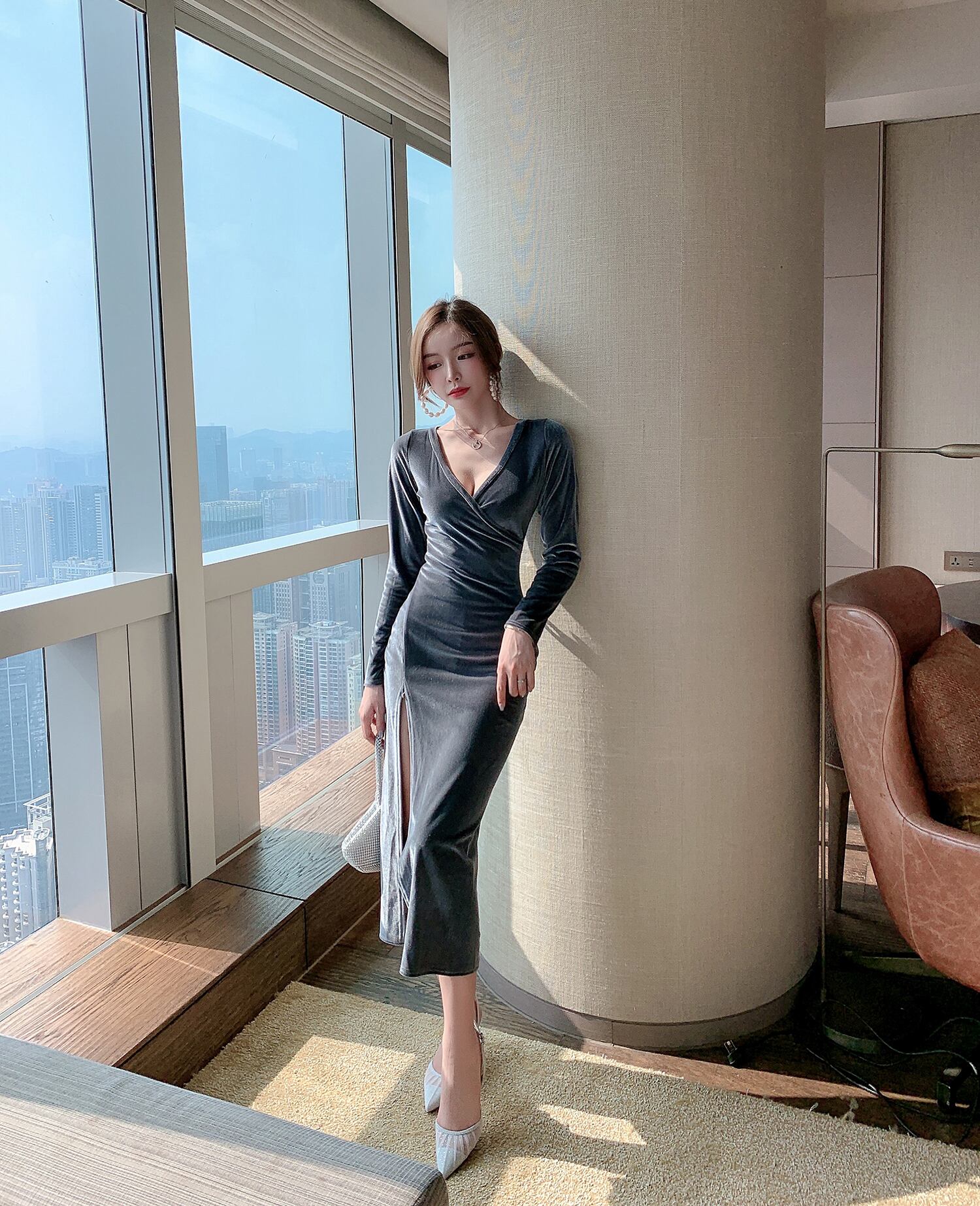フレンチレトロ気質女性らしさセクシースプリットロングスカートライトラグジュアリーレディース長袖ベルベットドレスレディース秋冬 オータム 秋物 ウィンター 冬物 yingd74806706159