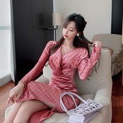 フレンチレトロウエストスリム気質ライトラグジュアリーレディースセクシーVネックバックレス長袖ベルベットドレスレディース秋冬 ロング オータム 秋物 ウィンター 冬物 yingd65257846397