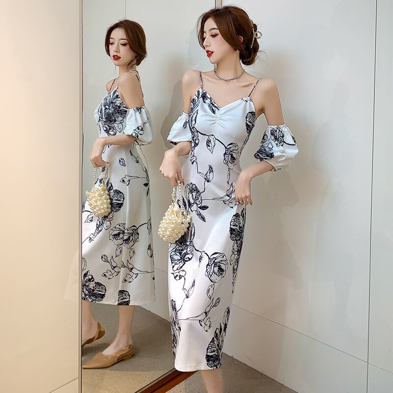 フランスのレトロな優しいスタイルのティーブレイクプリントサスペンダードレススリムフィットとスリム気質セクシーなストラップレスサスペンダードレス yingd52141987188