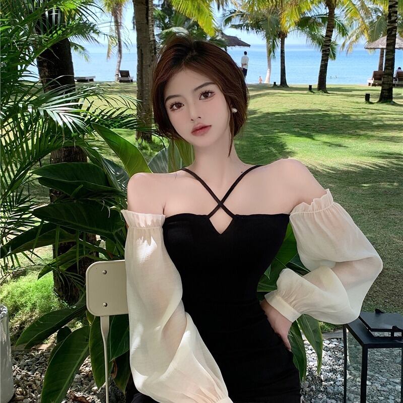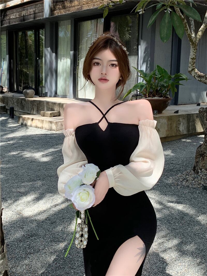 2022年春の新しいハイエンドシックでユニークなスカートスリムでセクシーなオフショルダーのスプリットサスペンダードレスの女性 スプリング 春物 yingd87305184934