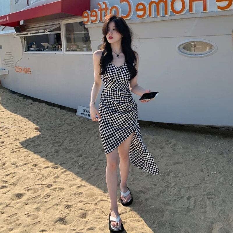 2022年新春服ニッチデザインロングスカートフレンチ香港スタイルレトロシックチェック柄サスペンダードレス女性 スプリング 春物 yingd60527997606
