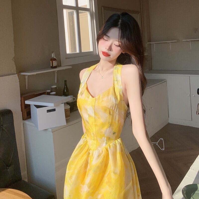 フランスの優しいスタイルのティーブレイク初恋フェアリースカートスーパーフェアリーエストウエストデザインセンスハンギングネックフローラルドレス女性 花柄 yingd47708545549