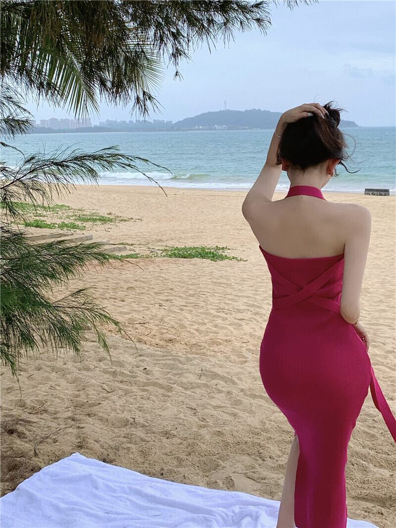 純粋な欲望スタイルのセクシーなニットホルターネックドレス女性の夏2022新しいスリムスリム気質セクシーなスリットロングスカート サマー 夏物 yingd17722379760