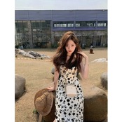 フレンチティーブレイクベルフラワーファーストラブロングスカートウエスト薄手気質優しいフローラルスリングドレスサマーセンス 夏物 花柄 フラワーデザイン yingd78859013286
