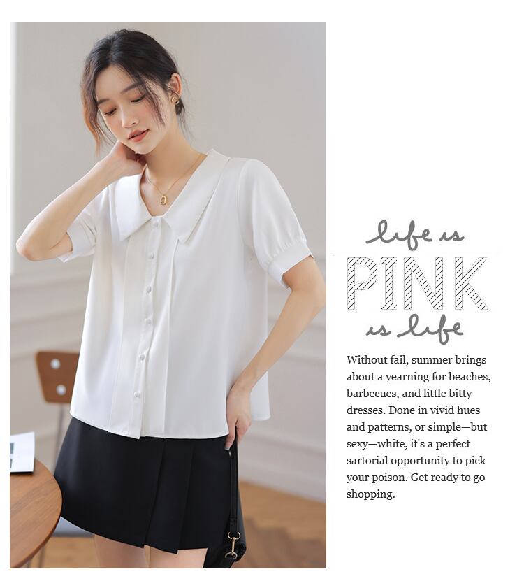 ドールカラーVネックホワイト半袖シフォンシャツレディースサマードレス2022新レトロデザインセンスニッチトップレディース 夏物 yingd25836972448