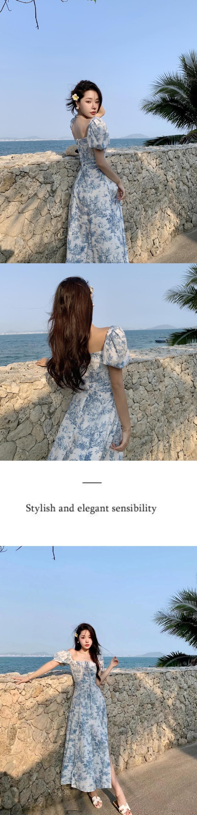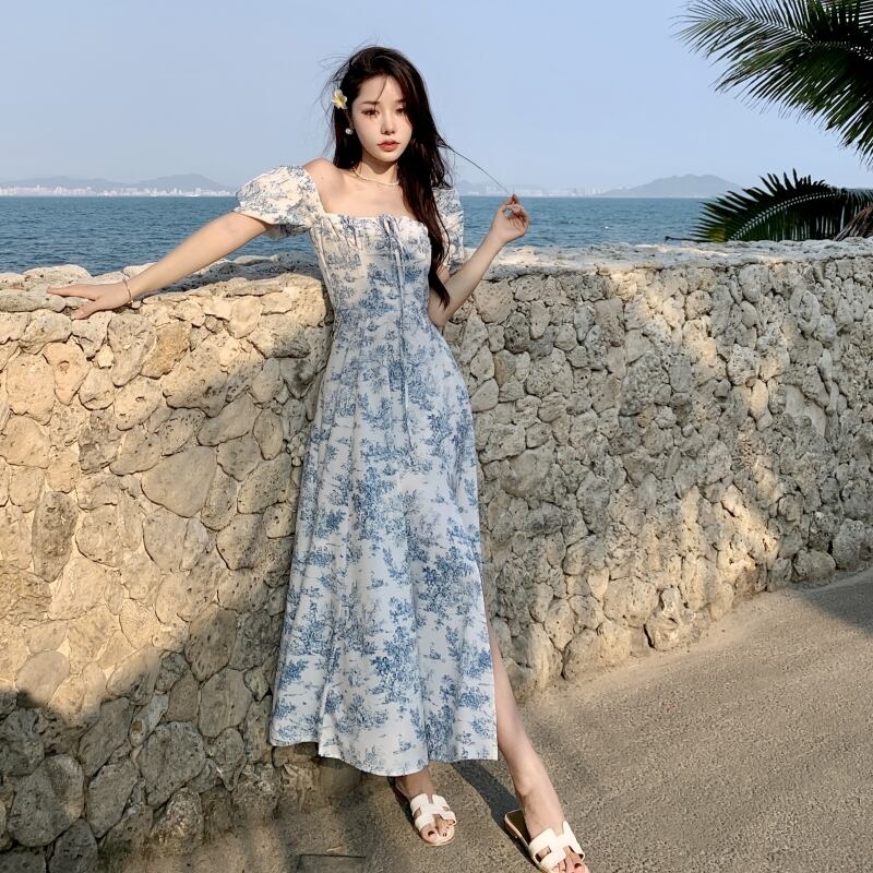 フランスのレトロなウエストアートハイエンドスカートフローラルスクエアネックバブル半袖ドレス2022新しい女性の夏 サマー 夏物 花柄 スクウェア yingd52631169966