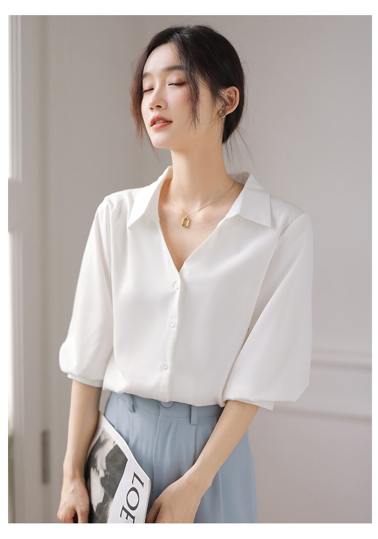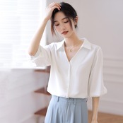 Vネックシフォンホワイトシャツレディース2022年夏新作レトロ香港風デザインセンスのニッチな優しい着こなしトップス サマー 夏物 yingd32117381537