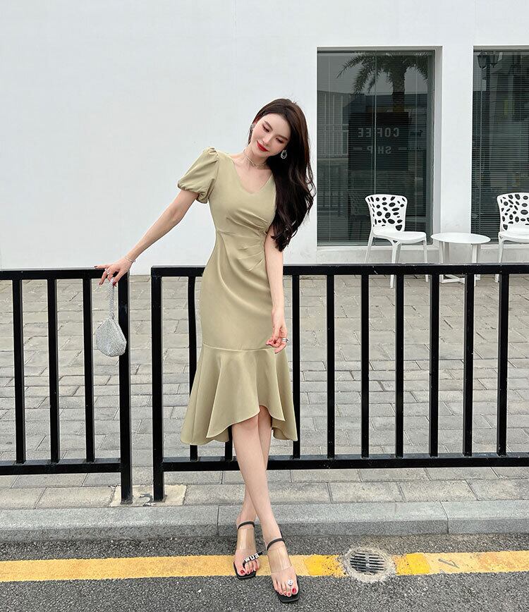 香港スタイルのレトロシックなスカートデザインプリーツVネックウエストフィッシュテールパフスリーブシックな見事なドレスの女性 yingd5748574500