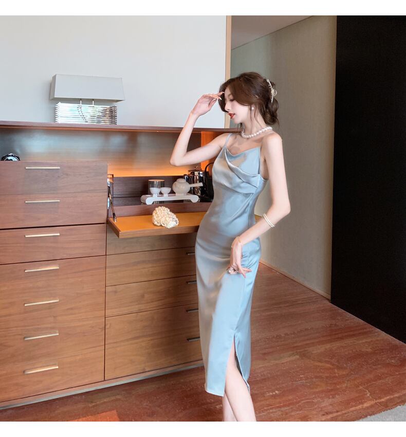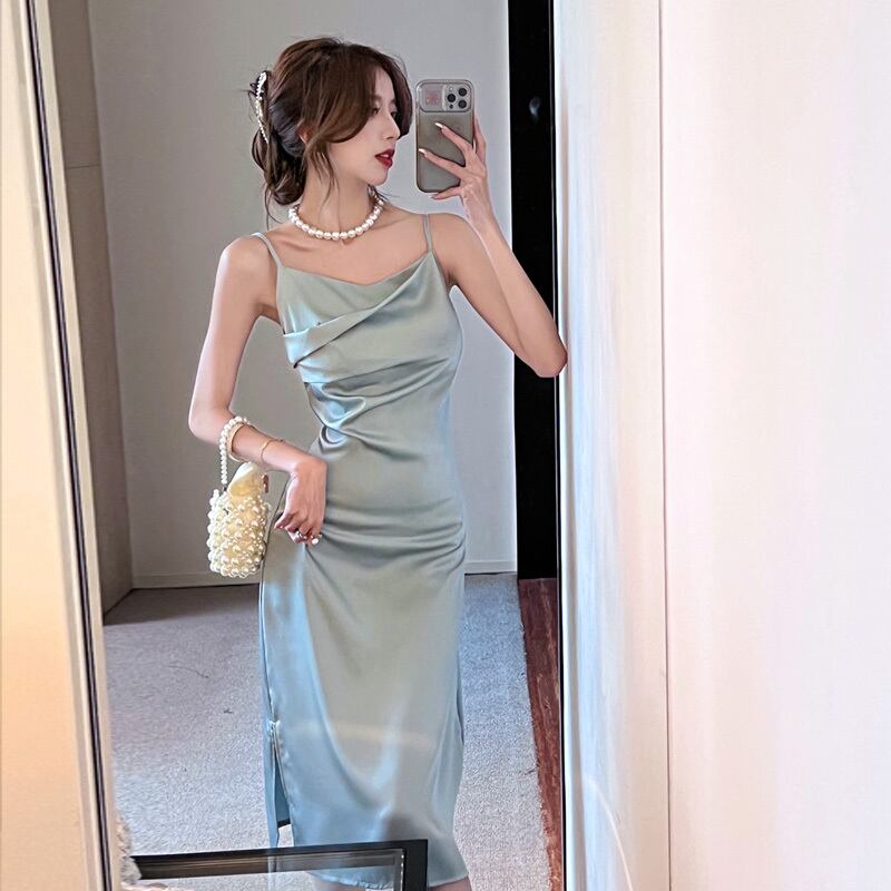 フランスのハイエンド女性の冷風サテンスイングカラーサスペンダードレスデザインセンスニッチ気質ロングスカート夏 サマー 夏物 yingd821874668