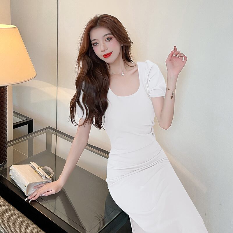 シックでユニークな見事なニッチなデザインのロングスカートウエストスリム気質レトロスクエアネックパフスリーブドレス女性の夏 サマー 夏物 スクウェア yingd70746680899
