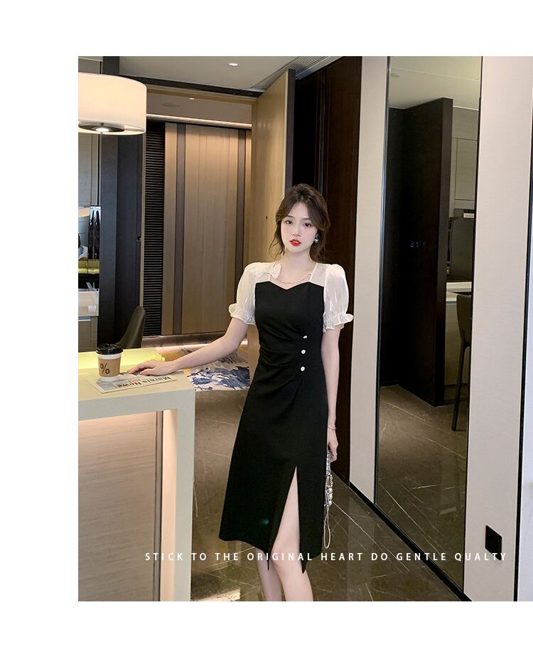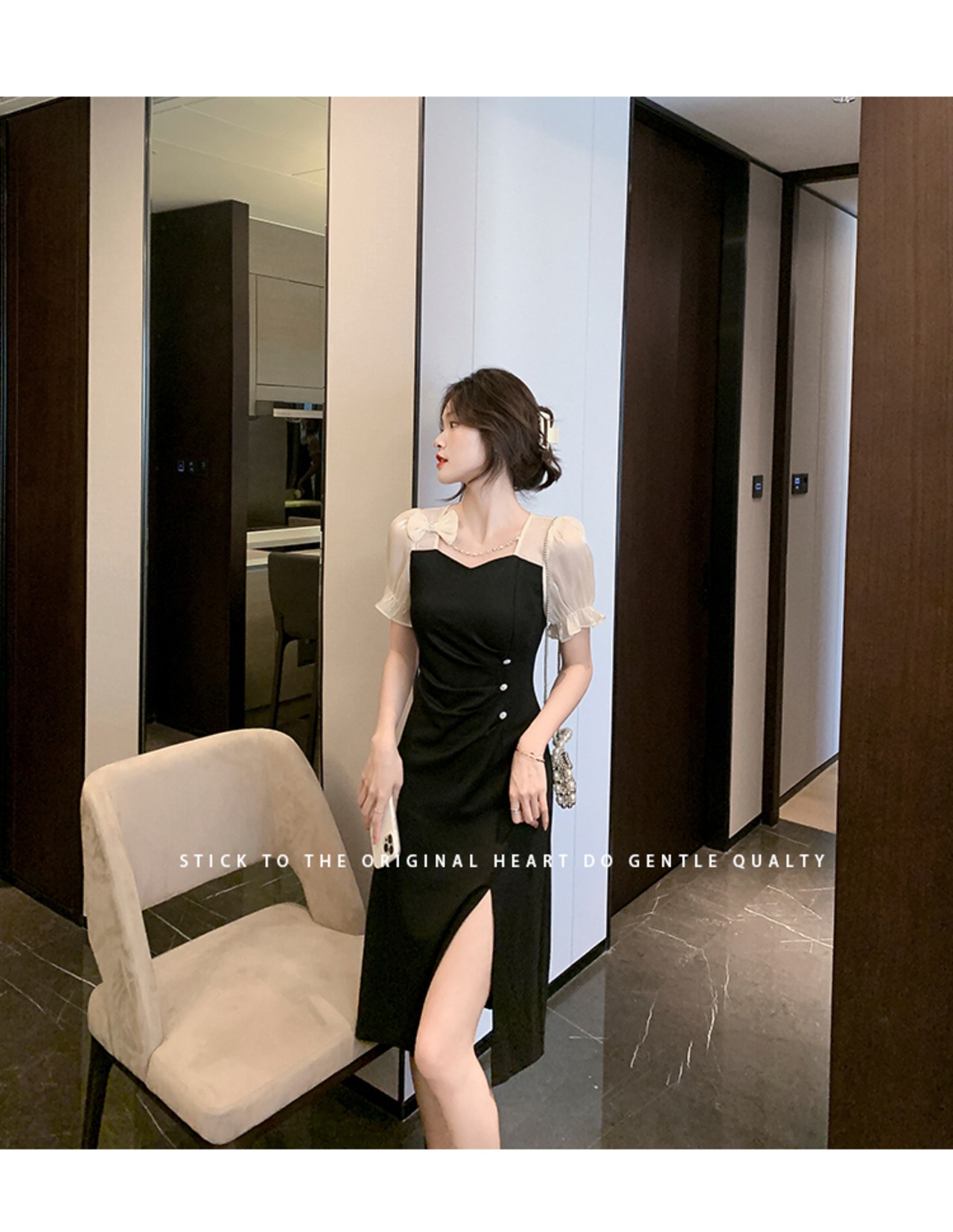 シックなウエストスカートテクスチャーハイセンスロイヤルシスタースクエアネックボウシフォンステッチドレス2022新作女性 リボン スクウェア yingd76243808892