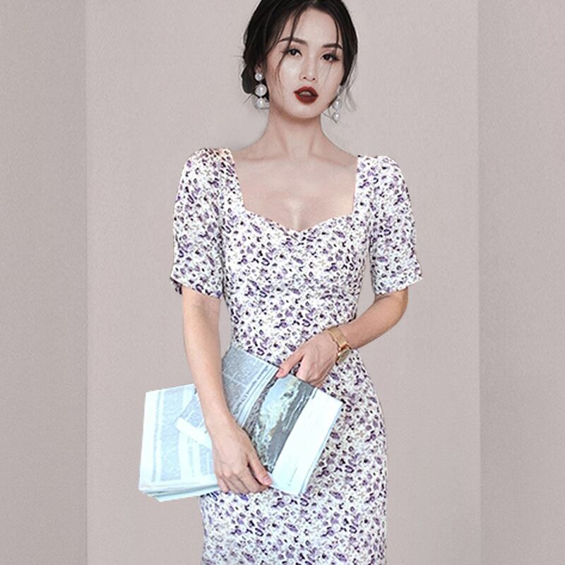 フランスのレトロな贅沢な初恋ティーブレイクスカートシックなウエストと薄い気質のスクエアネックフローラルドレス2022 花柄 スクウェア yingd10298451574
