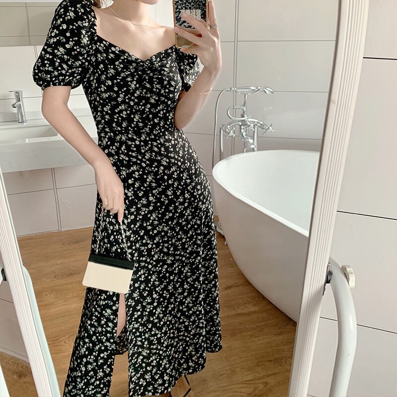 フランス初恋スウィートティーブレイクスクエアネックパフスリーブスモールフレッシュフローラルドレスブラック気質ロングスカート女性夏 大人ガーリー キュート カジュアル サマー 夏物 花柄 スクウェア yingd85392784209