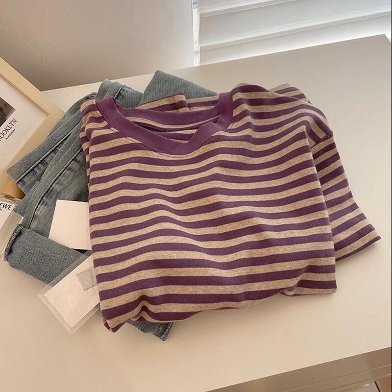 ヨーロッパの駅の女性の最初の愛のシャツアメリカのレトロなフロントショルダーTシャツ人気のパープルストライプ半袖インタイド ヨーロピアン yingd86034057944