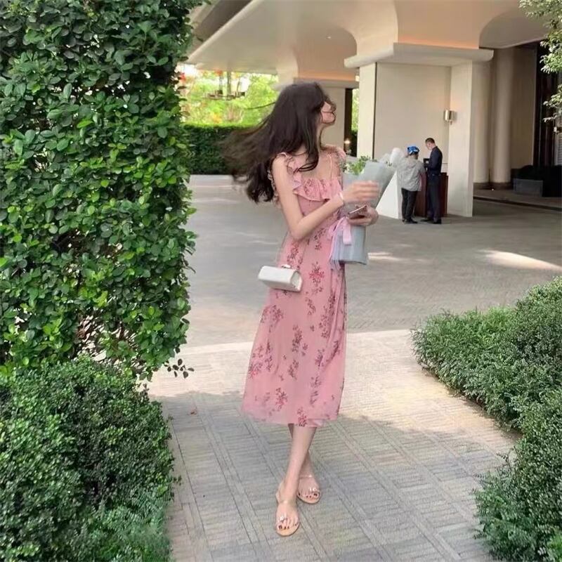 フレンチスクエアネックフローラルドレス2022年新作レディースサマーシックウエストシンハイエンドファーストラブティーブレイクスカート 夏物 花柄 スクウェア yingd5686700852