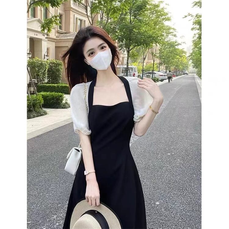 フランスのレトロなヘップバーンスタイルのハイエンドロングスカートニッチデザインシックなウエストスクエアカラードレス2022新しい女性 スクウェア yingd13305428137