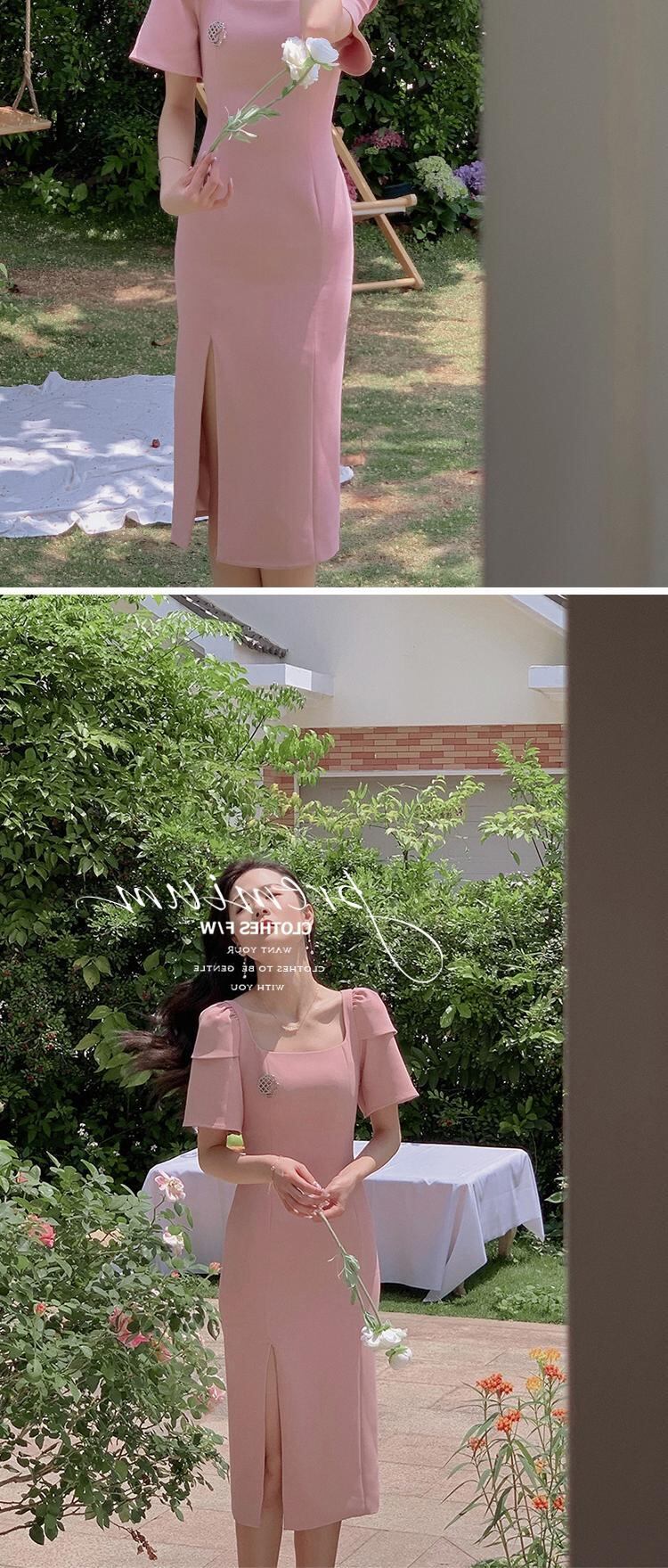 ゆじえファン揚げストリートサマードレスシックでユニークな見事なスカートテクスチャーハイエンドレトロスクエアネックスリットドレス女性 夏物 スカート スクウェア yingd13596563018