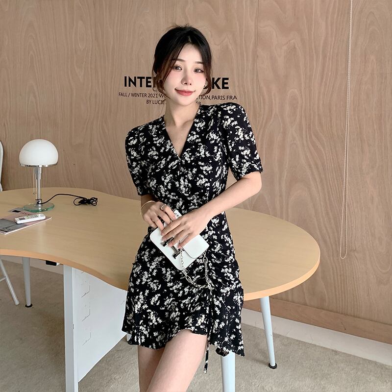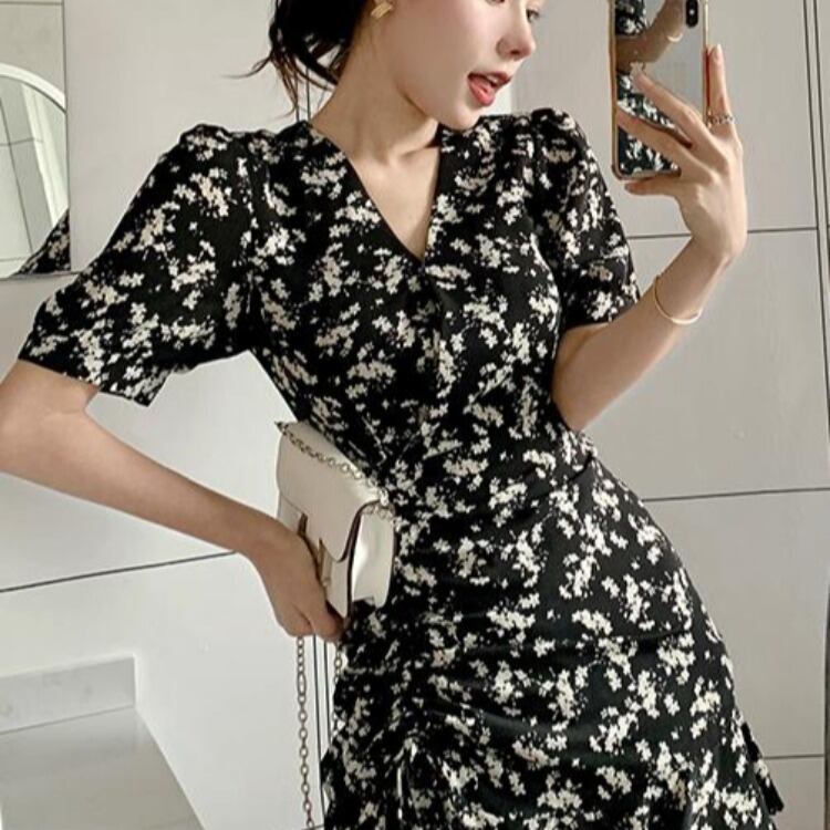 フランスのレトロな芸術的センスの初恋スカートテクスチャーハイエンドウエストと細いVネックフローラルドレス女性の夏 サマー 夏物 花柄 yingd85304084629
