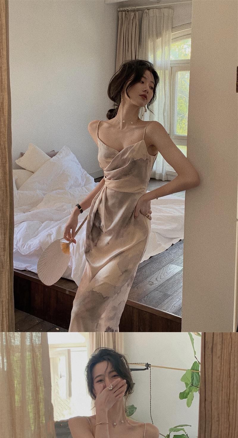シックでユニークな見事なサスペンダースカートテクスチャハイエンドデザインニッチサテンホルターサスペンダードレス女性の夏 サマー 夏物 yingd34465347419