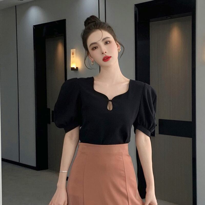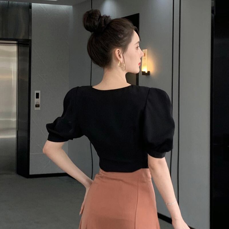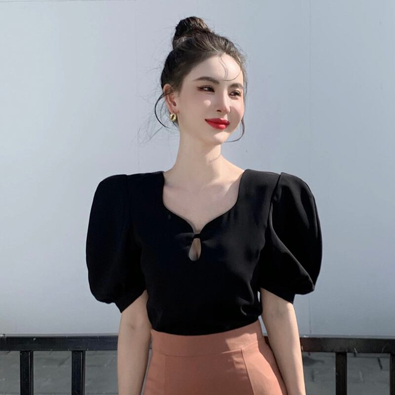 ブラックパフスリーブシフォンシャツレディース2022夏新作デザインスモールフレンチユニークショートトップ サマー 夏物 yingd9752032725