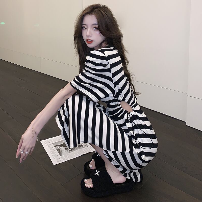 シックでユニークな見事なロングスカートニッチデザインセクシーなウエストレススリットストライプスクエアネックドレス女性の夏のハイエンド サマー 夏物 スクウェア yingd60396169189