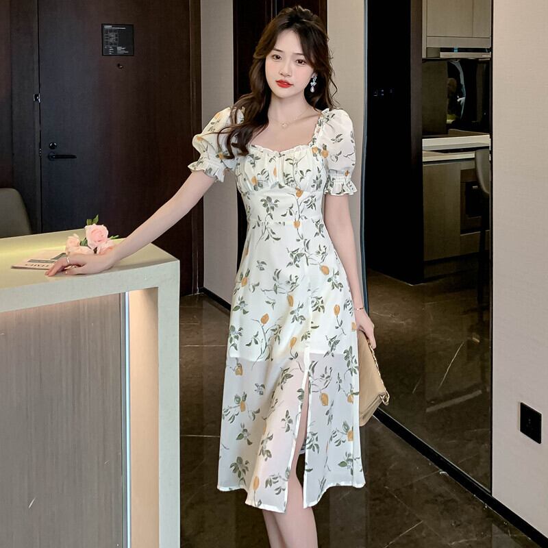 フランスの優しいティーブレイクベルフラワーウエストフローラルドレス2022新しい女性の夏のパフスリーブスプリットロングスカート サマー 夏物 花柄 フラワーデザイン yingd55808256330