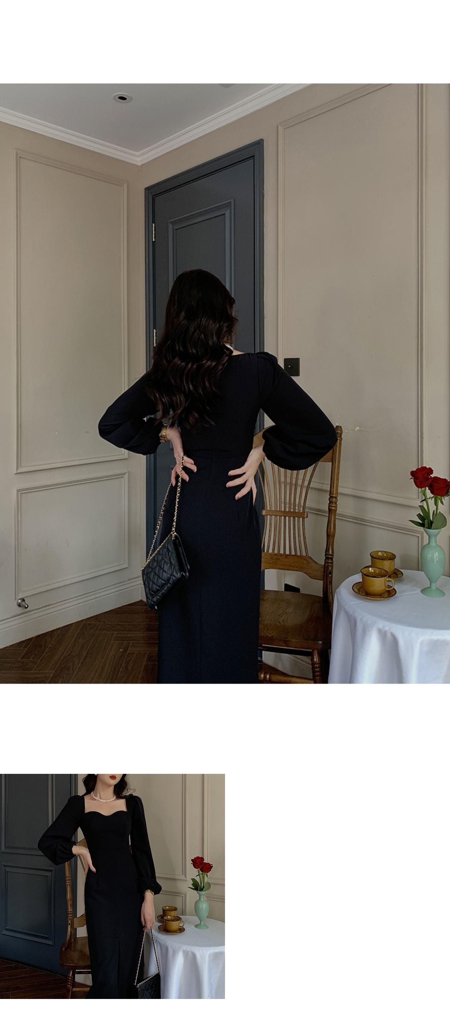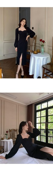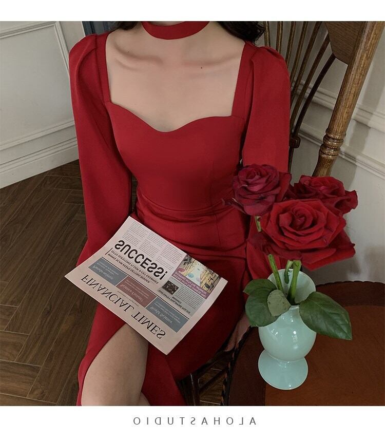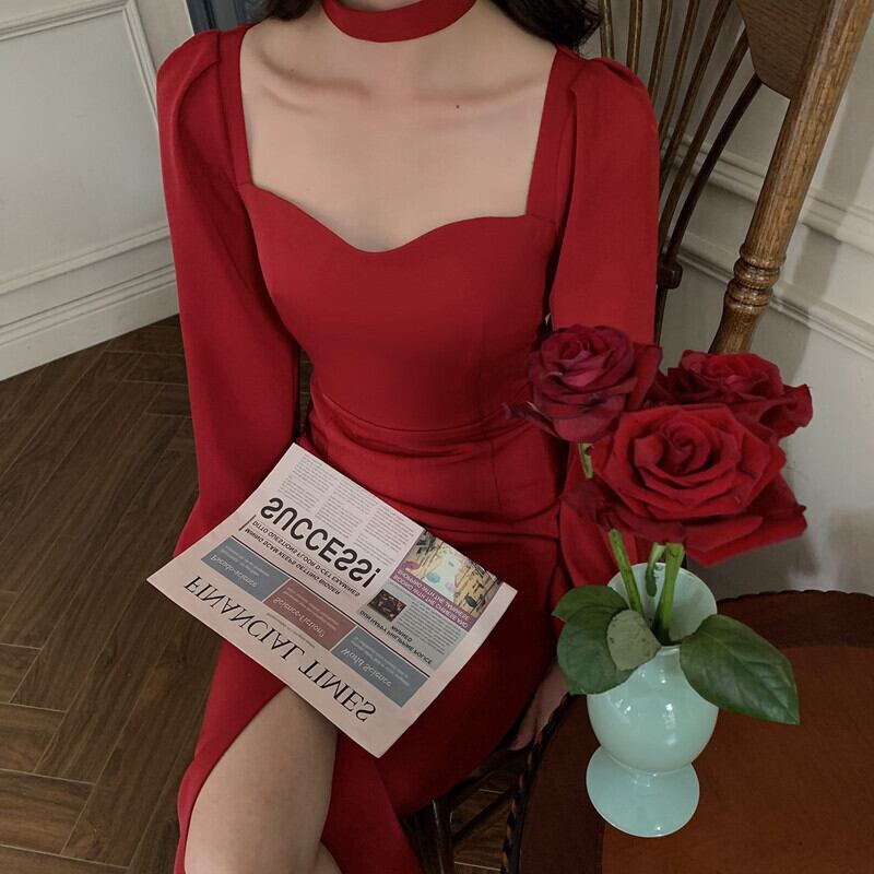 フランスのレトロなヘップバーンスタイルの赤いドレススリムフィットと薄い気質の女神ファンスクエアカラーランタンスリーブドレス秋と冬 レッド オータム 秋物 ウィンター 冬物 スクウェア yingd46728622534