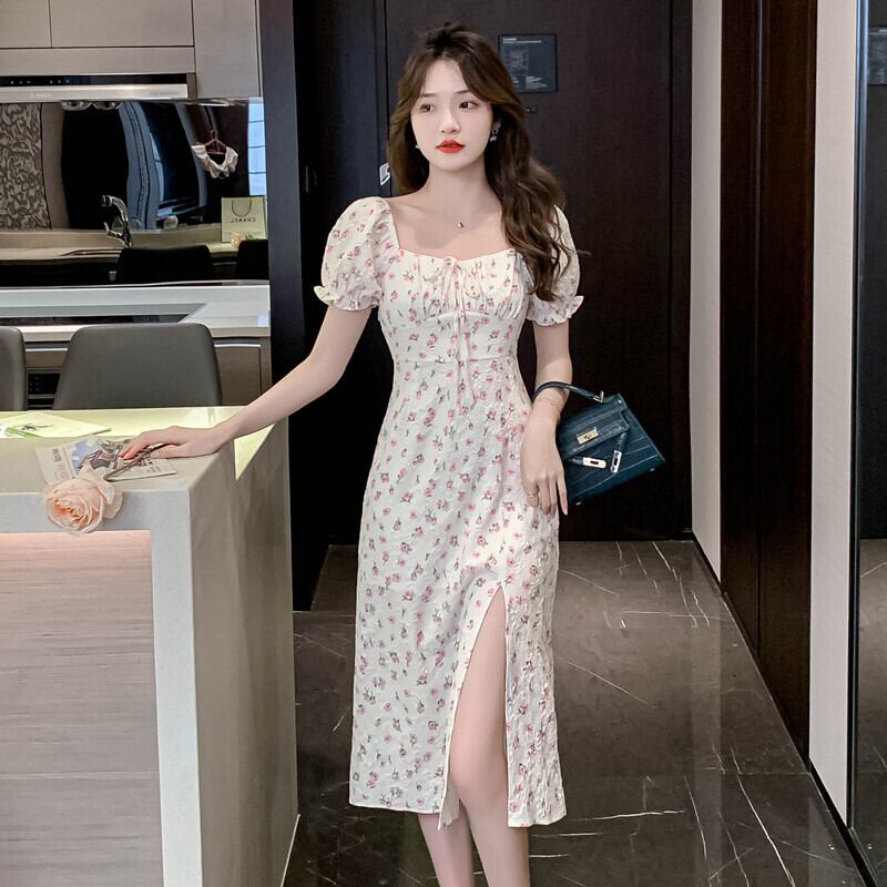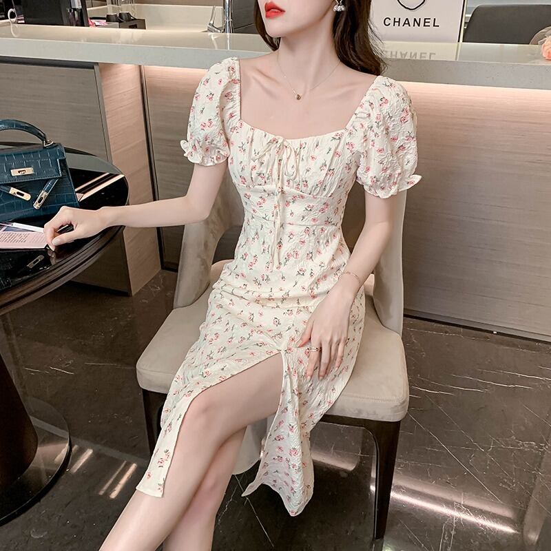 フランスの優しいスタイルのスクエアネックフローラルドレス女性2022年夏新しい気質ニッチデザインハイエンドスリットロングスカート サマー 夏物 花柄 スクウェア yingd73044904574