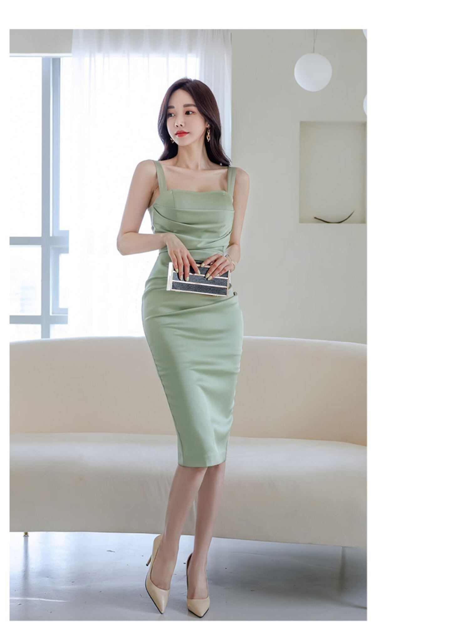フランスの冷風女性のハイエンドデザインセンスプリーツセクシーパッケージヒップアセテートサテンサスペンダードレス女性の夏 サマー 夏物 yingd74103062267