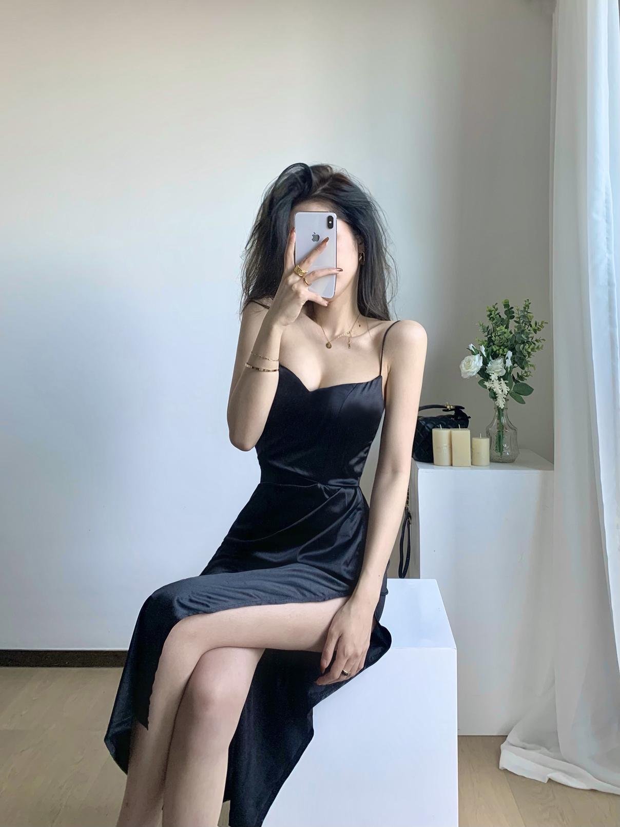 見事なサスペンダードレススリムフィットとスリム気質シックなデザインプリーツYujieスプリットサスペンダードレス女性の夏 サマー 夏物 yingd24147490775