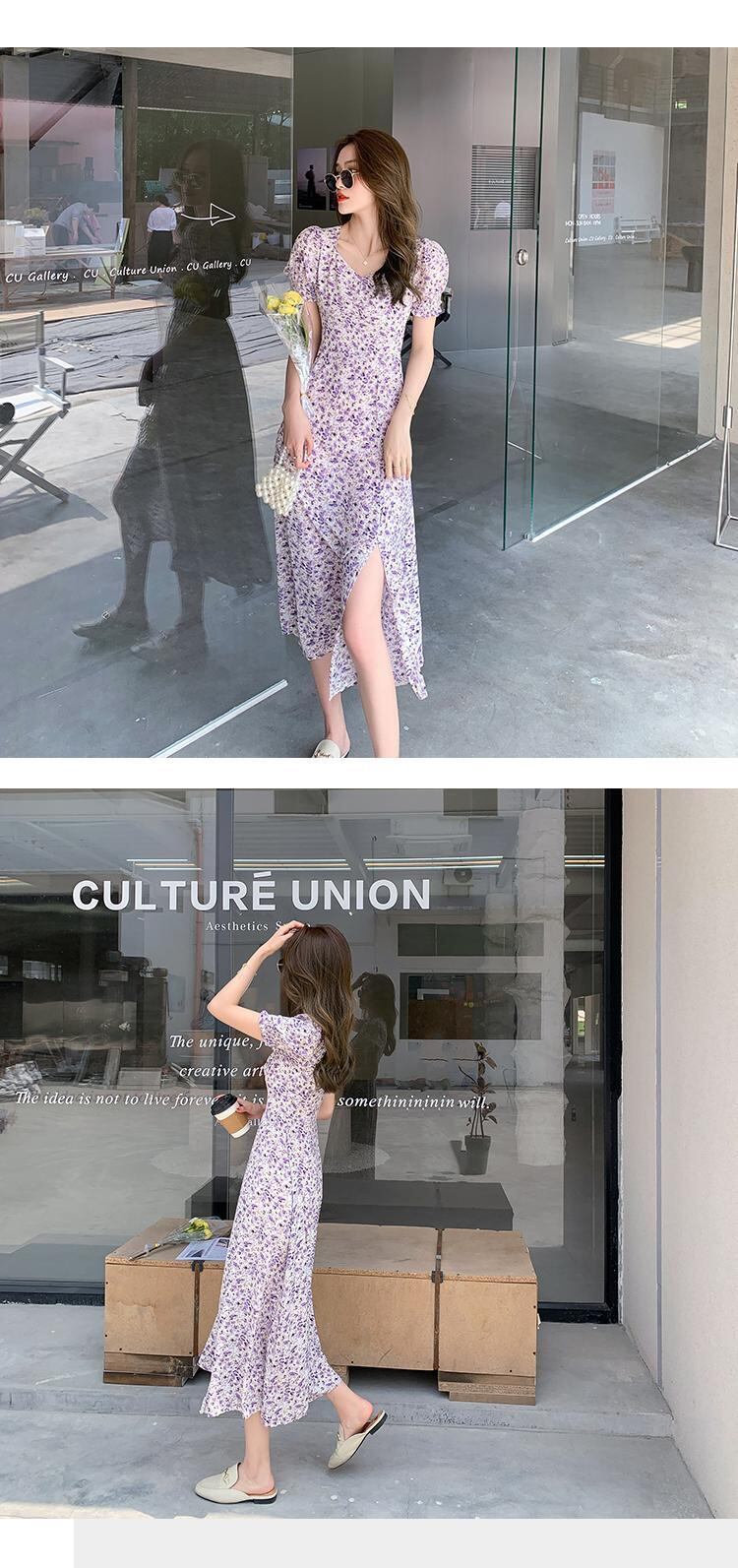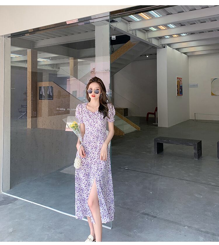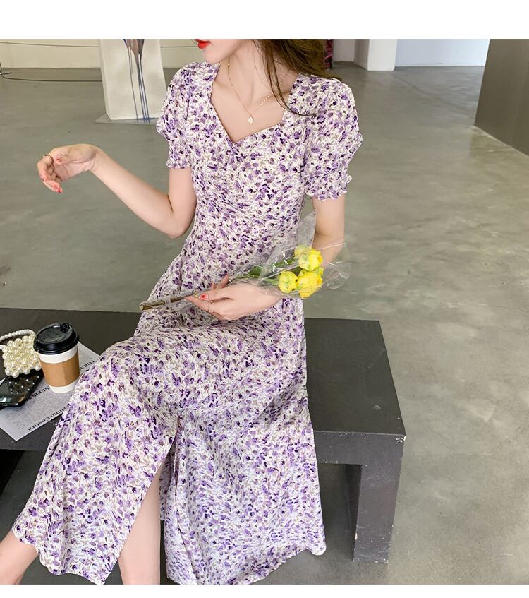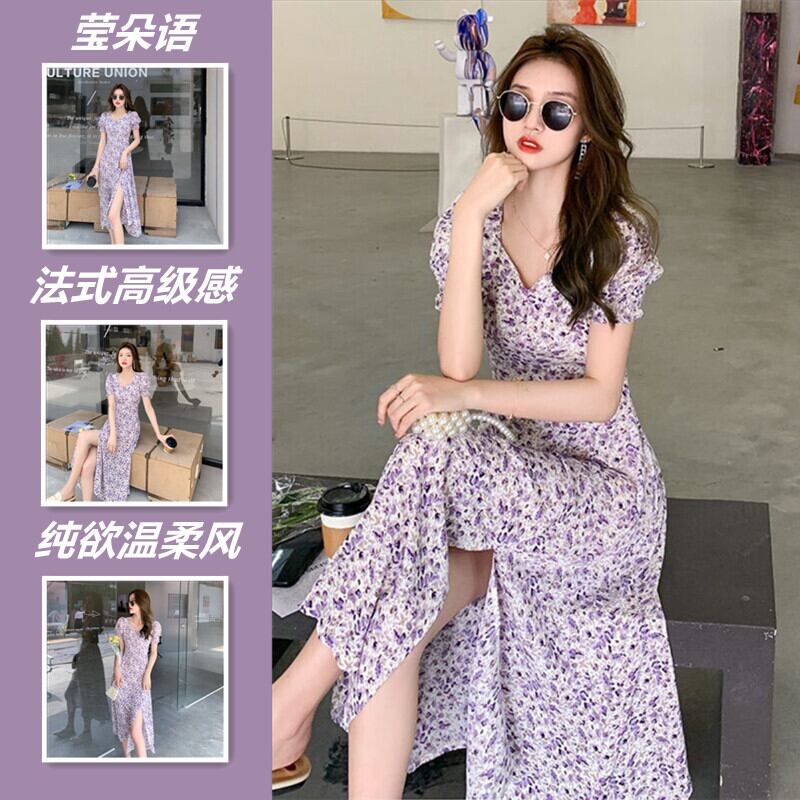 フレンチジェントルティーブレイクファーストラブフローラルロングドレススリムフィットスリムシン気質センススプリットシフォンドレスサマー 夏物 花柄 yingd45000033870