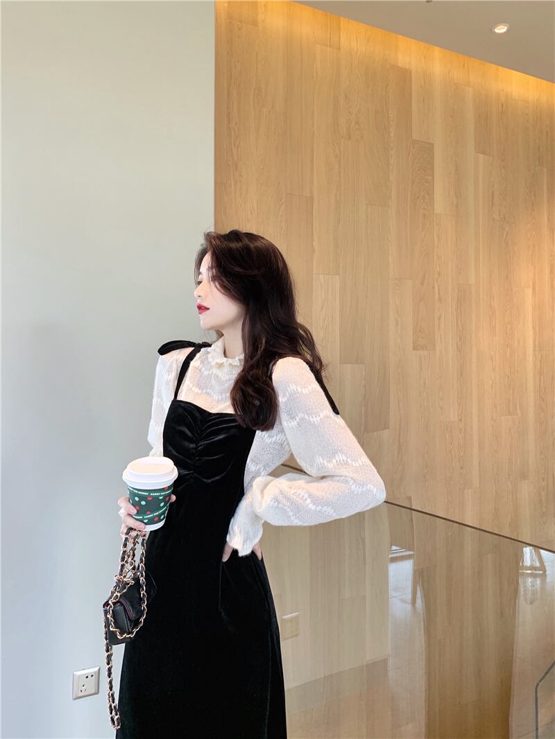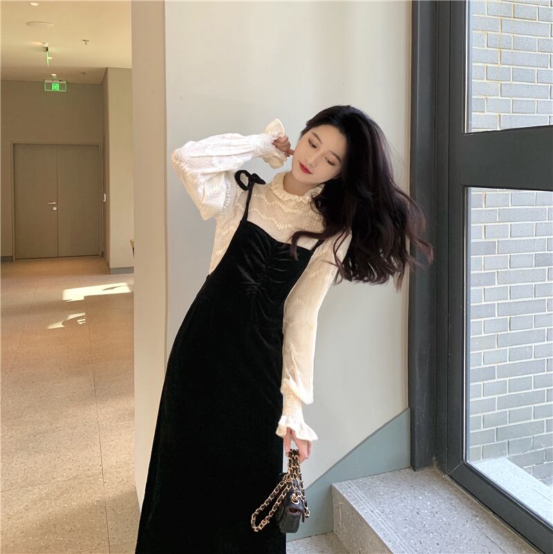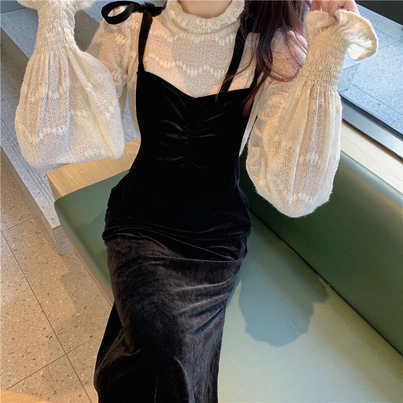 フランスのレトロなウエストと細い気質の女性の優しい風のレースのボトミングシャツベルベットのサスペンダードレスツーピース yingd47787183441