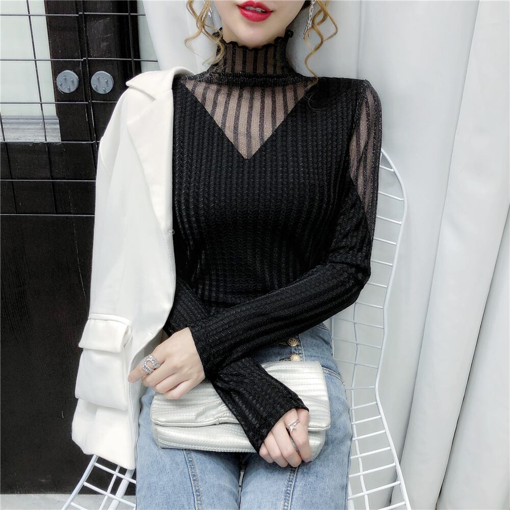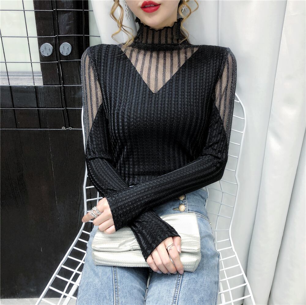 ハーフタートルネックプラスベルベットボトミングシャツレディース秋冬新スタイルセクシーメッシュブライトシルクニット長袖Tシャツレディーストップ ロング オータム 秋物 ウィンター 冬物 yingd71571521886