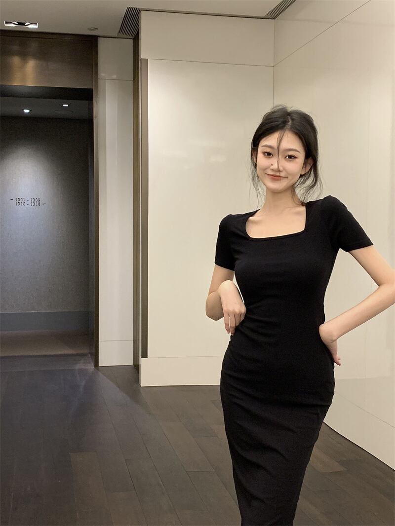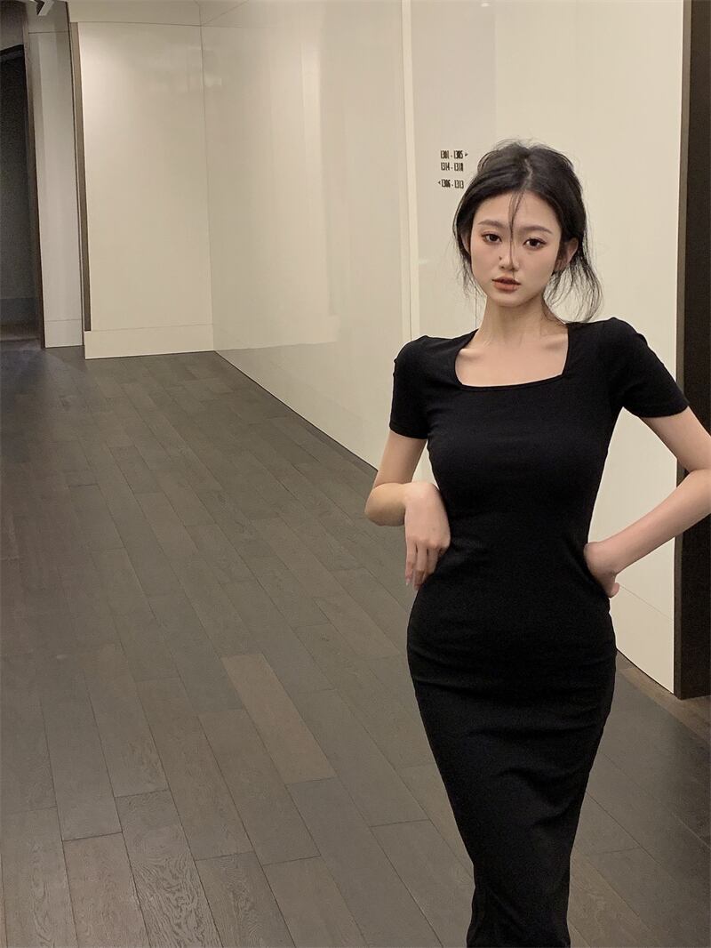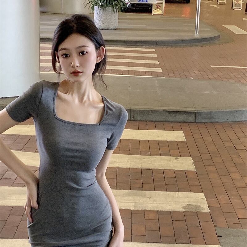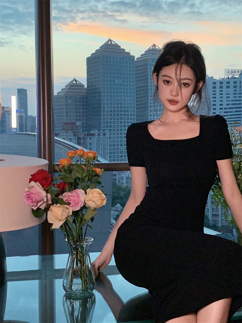 フランスのレトロなハイエンド スカート冷たい風スリム スリムな気質セクシーなパッケージ ヒップ スクエア ネック ドレス夏の女性 サマー 夏物 スクウェア yingd60527936644