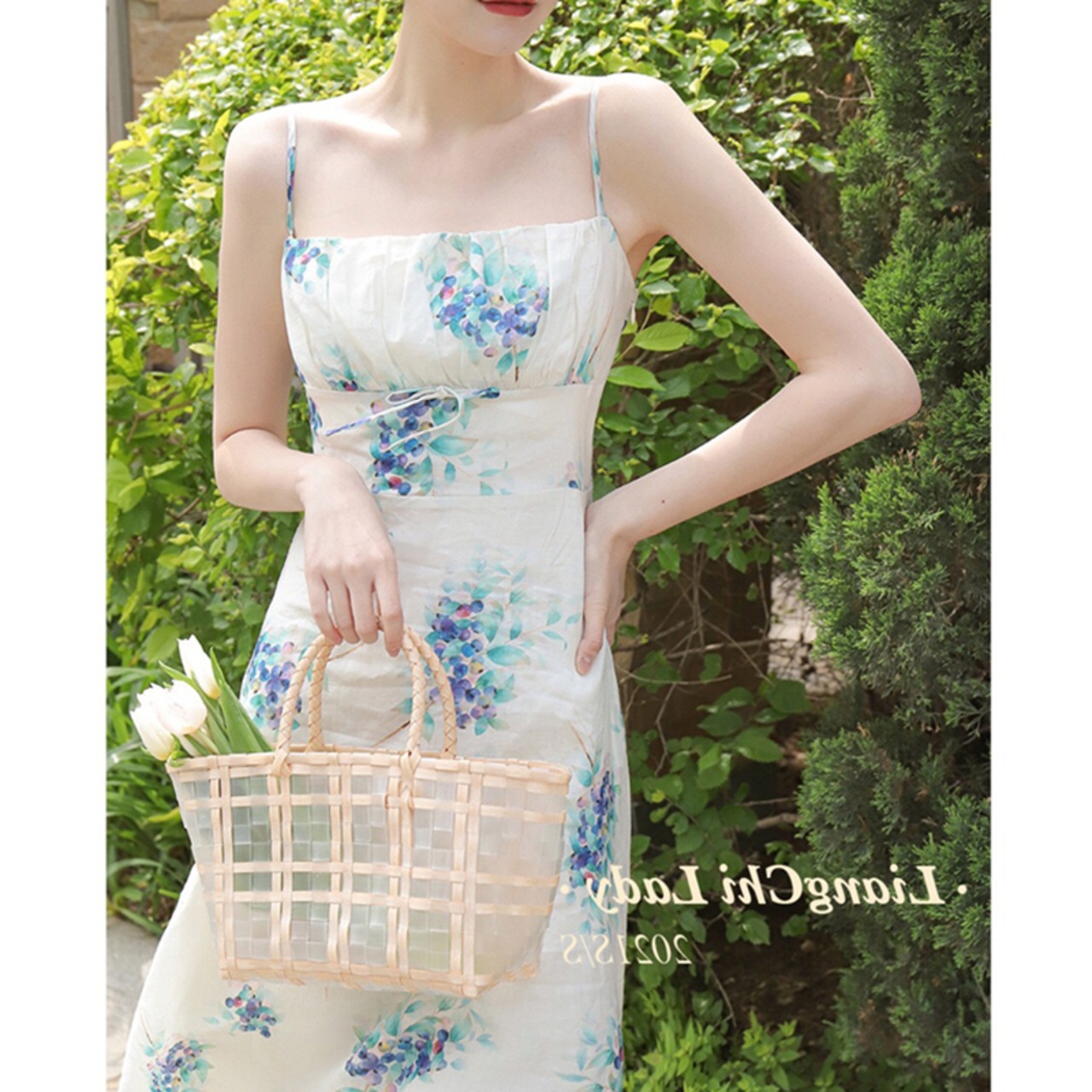 フレンチティーブレイク、シック、見事、美しい花柄サスペンダードレス、気質、淑女、ハイエンド、白花柄ドレス ホワイト yingd88430355286