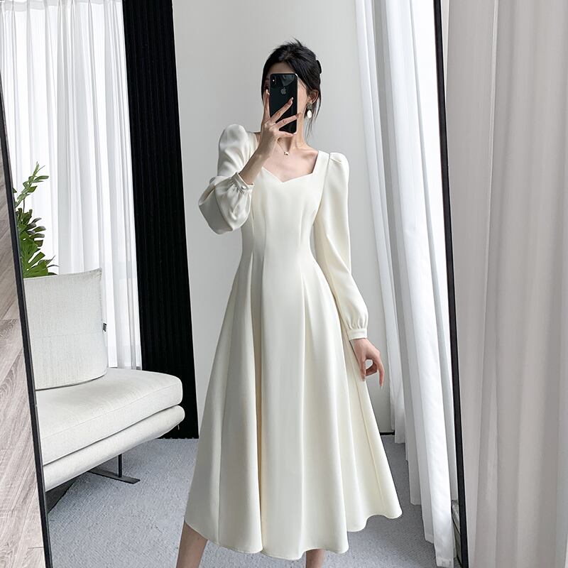 秋の新 2022 ホワイトドレス女性のシックでユニークなスカートハイエンドセンスウエスト薄いスクエアカラーロングスカート オータム 秋物 スクウェア yingd52614253038