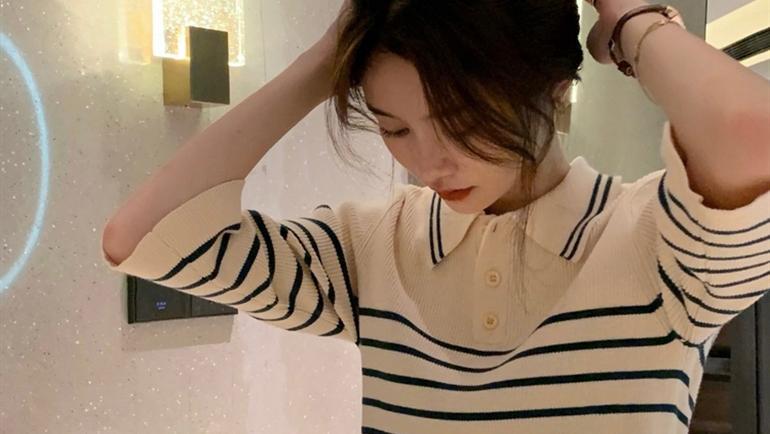 今年の人気セーター コート初秋トップ女性の新しいポロ ストライプ セーター ベルスリーブ ボトムス シャツ女性 オータム 秋物 yingd44147000131