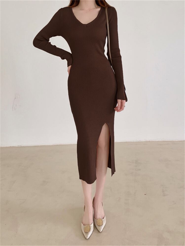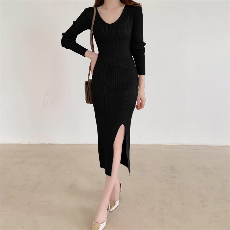 秋の新フレンチブラックハイエンドvネックドレス2022ウエストスリムセクシーなスリットニットロングスカート オータム 秋物 yingd3201483168