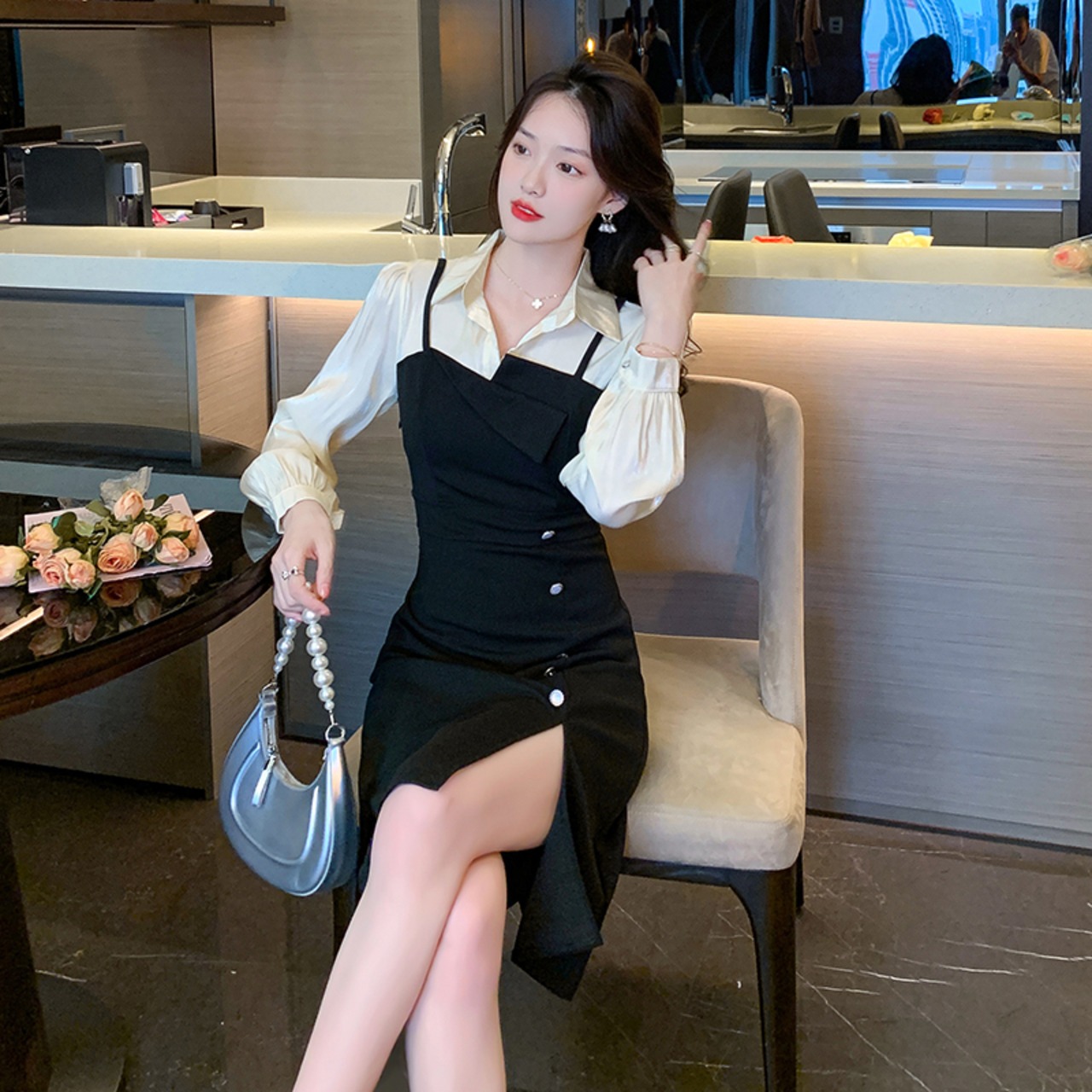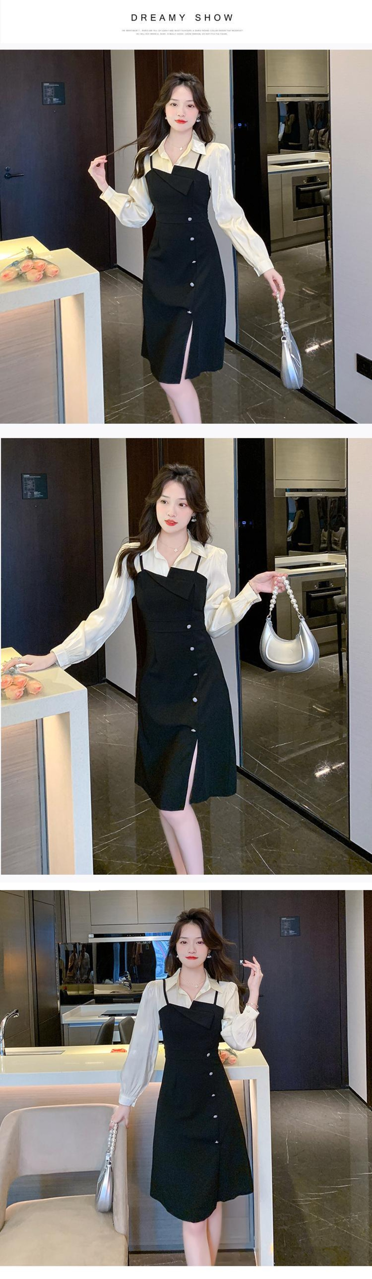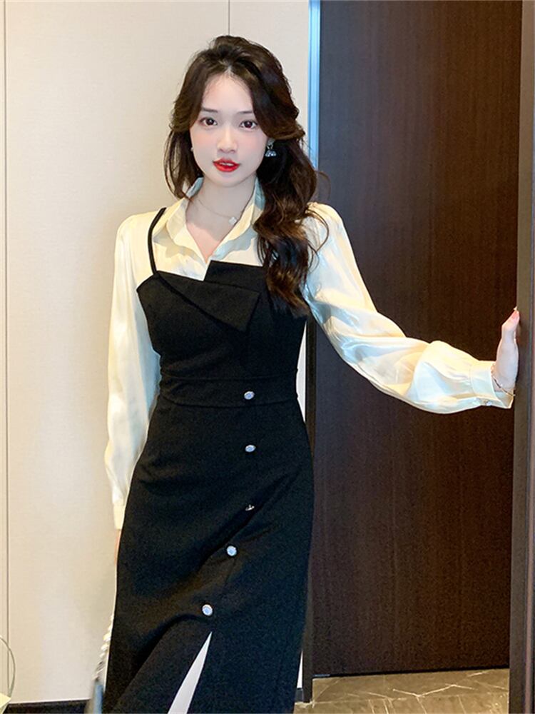 秋ドレス気質女神ファン新 2022 フランスハイエンドヘップバーンスタイル長袖ドレスレトロスリットドレス ロング オータム 秋物 yingd81212330608