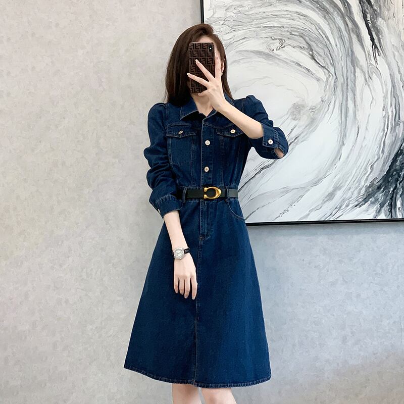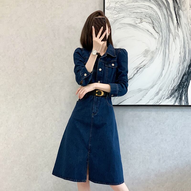 2022 初秋の女性のファッション優しいベルサイユデニムスカートフレンチ気質ハイエンドスリット長袖ドレス ロング オータム 秋物 yingd73693651855