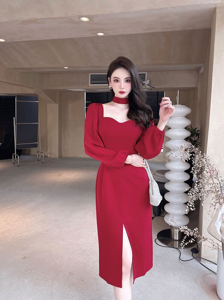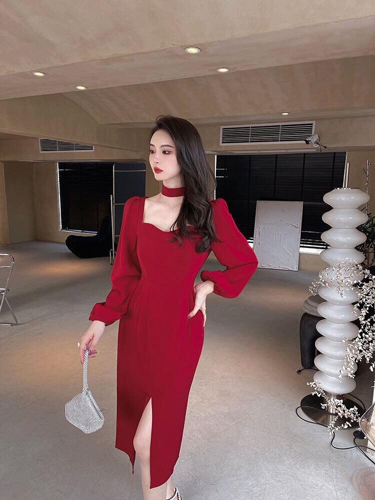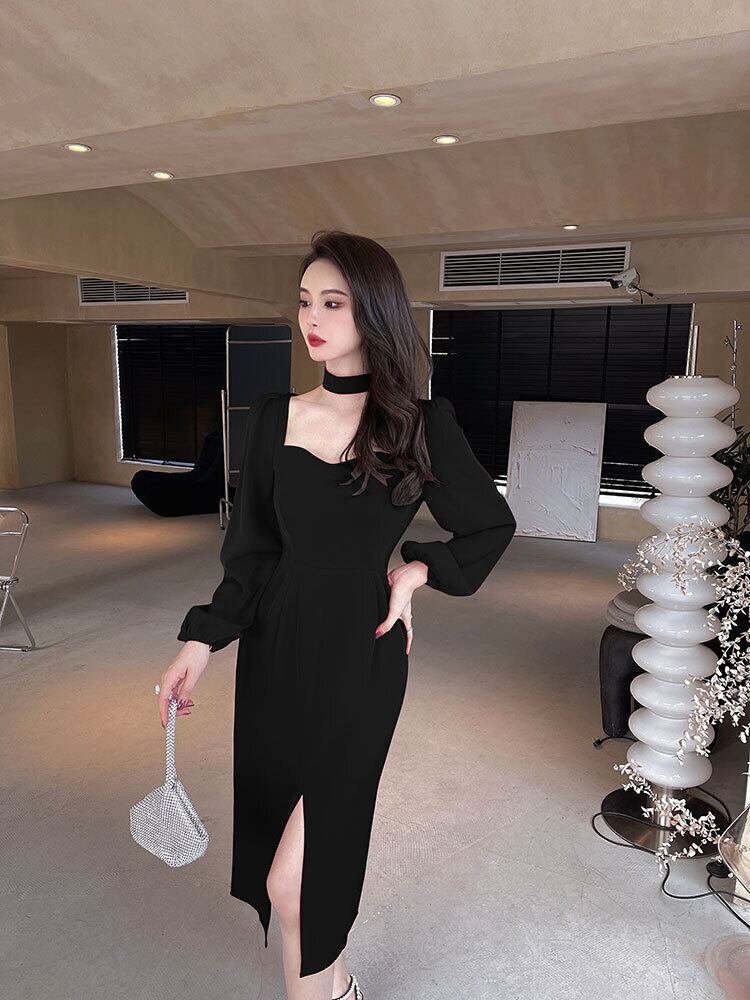 2022 新秋ドレス気質女神ファンユニークな肉被りヘップバーンリトルブラックドレスレトロスクエアカラー長袖ドレス女性 ロング オータム 秋物 スクウェア yingd7292936372