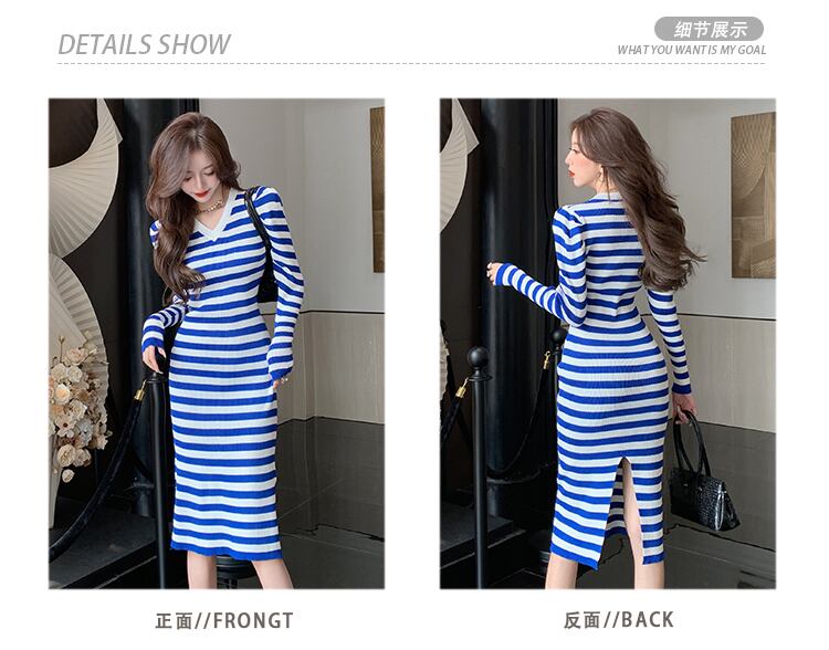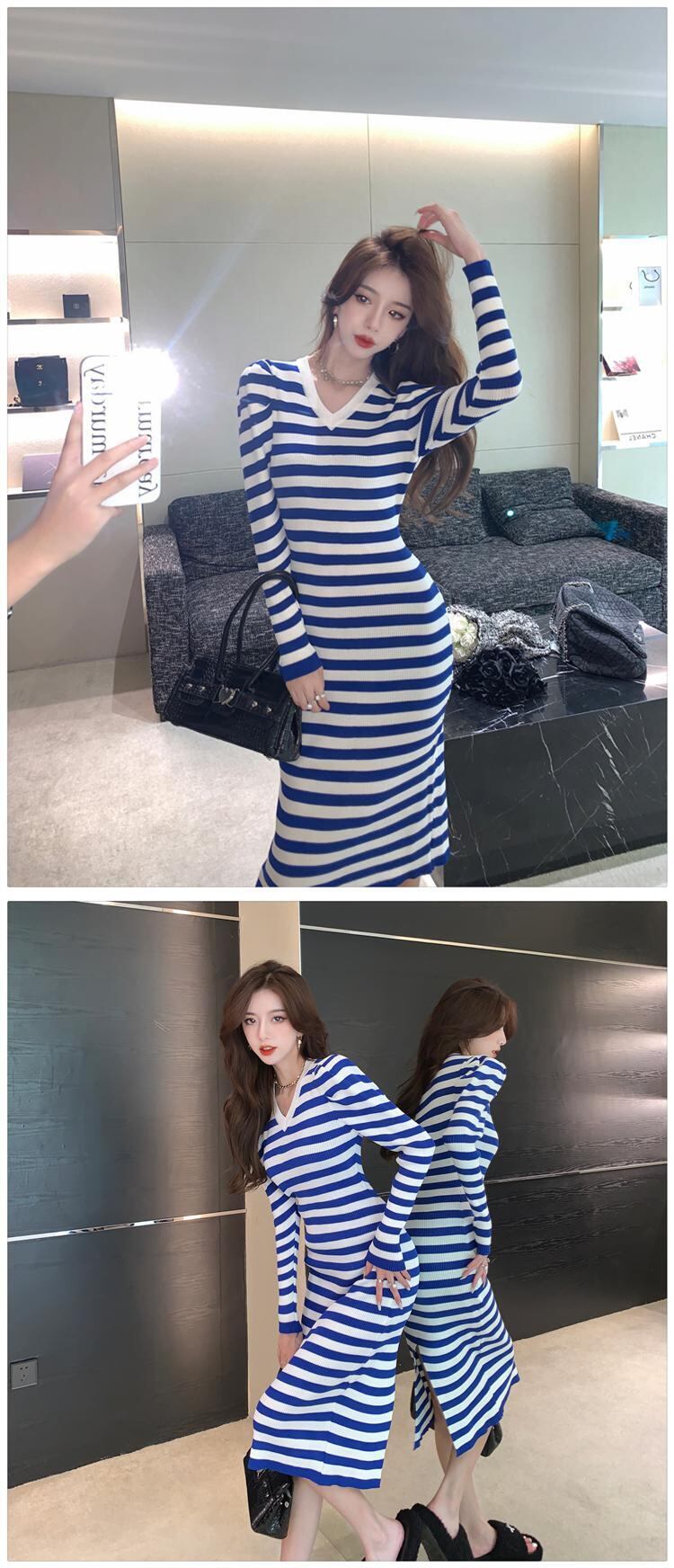 秋の新 2022 シックでユニークなスカートウエストフレンチハイエンドドレスニットストライプロングスカートの女性 オータム 秋物 yingd19613369634