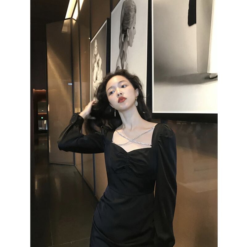 黒のドレス 2022 新しい女性のウエスト甘くてスパイシーなスカートレトロスクエアカラーロングスリーブヘップバーンスタイルリトルブラックドレス 長袖 大人ガーリー スウィート キュート カジュアル スクウェア yingd99773166108
